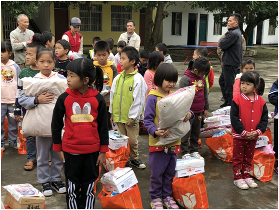 2018年11月17日,由盛邦集团员工自发组织的爱邦义工队满载物资回访广西河池大化县共和乡水力小学,给这里的38位留守儿童和4位美丽的乡村教师送去电脑、打印机、棉被、校服、运动鞋、文具用品等各类物品,为13名特困孩童送来了补助金,与孩子们度过了难忘的一天。同时义工队队员们翻山越岭,对家在大山之中的5家贫困家庭进行了家访,并送去慰问品与慰问金。这一天简单却温暖,没有过多的寒暄,只有对孩子们的万分爱意和真切关怀,孩子们纯真而羞涩的脸上则是掩饰不住的开心。